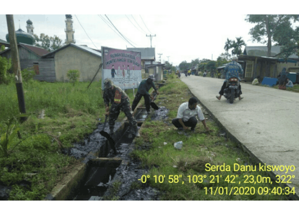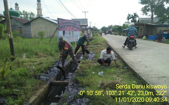 GAS - Babinsa Teluk Pinang Koramil 05/Gaung Anak Serka melaksanakan Gotong royong pembersihan drainase dan gorong gorong di Jalan Merdeka Kelurahan Teluk Pinang Kecamatan Gaung Anak Serka Sabtu (11/01/2020).