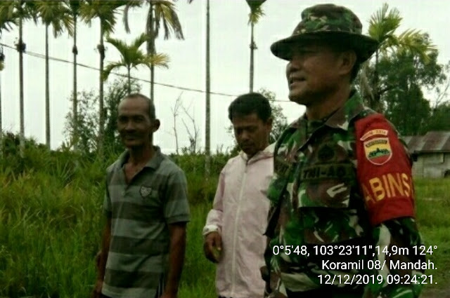 seribuparitnews.com MANDAH,- Babinsa Koramil 08/Mandah rutin melakukan patroli dan sosialisasi serta pengawasan Karhutla. Selain itu, juga memberikan himbauan kepada masyarakat wilayah binaan, dalam upaya mengantisipasi terjadinya peristiwa kebakaran hutan dan lahan. Satu di antaranya di Desa Sandawa, Kecamatan Mandah, Inhil, Kamis (12/12/2019).