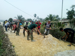 seribuparitnews.com RETEH - Sambil bekerja melakukan penimbunan jalan dengan sirtu SatgasTMMD Ke-106 Kodim 0314/Inhil bersama-sama masyarakat terlihat hangat bersenda gurau, Jumat (11/10/2019)