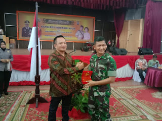 Dandim 0314/Inhil pun memberikan Cendra mata kepada AKBP Christian Rony Putra SIK MH sebai unkapan Kebersamaan dalam melaksanakan tugas di Inhil.