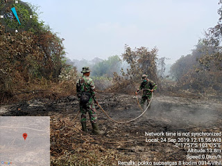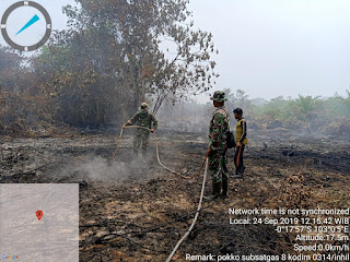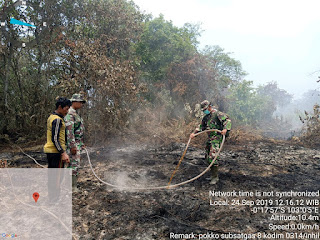 Batang Tuaka- Babinsa dan Personil Koramil 12/Batang Tuaka bersama masyarakat  melaksanakan pengecekan dan pendinginan lahan terbakar di Desa Kuala Seibatu, Kecamatan Batang Tuaka, Senin (24/9/2019).