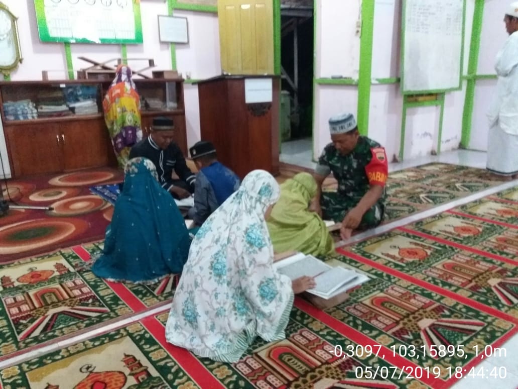 Koramil 01 Tembilahan melalui Babinsa Seberang Tembilahan Selatan Serda M.Yasin  Koramil 01/Tembilahan melaksanakan pendampingan magrib mengaji  di Mushola Babussalam jalan sungai beringin Kelurahan Seberang Tembilahan  Selatan Jumat (05/07/2019).