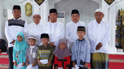 Diakhir acara Camat Tembilahan Hulu M.Nazar, S.Sos.M.Si foto bersama dengan anak yatim dan Pengurus Masjid Al-Ikhlas YAMP Tembilahan Hulu. (ds)