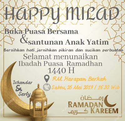 Diberitahukan kepada saudara/i adik adik ikut menghadiri acara buka bersama dan santunan yang akan dilaksanakan oada hari sabtu tanggal 25 Mei 2019 pada pukul 16.30 bertempat di RM Harapan Berkah samping Wisma Selvira jalan Telaga Biru kec. Tembilahan Hulu Pakaian menyesuaikan.(ds)