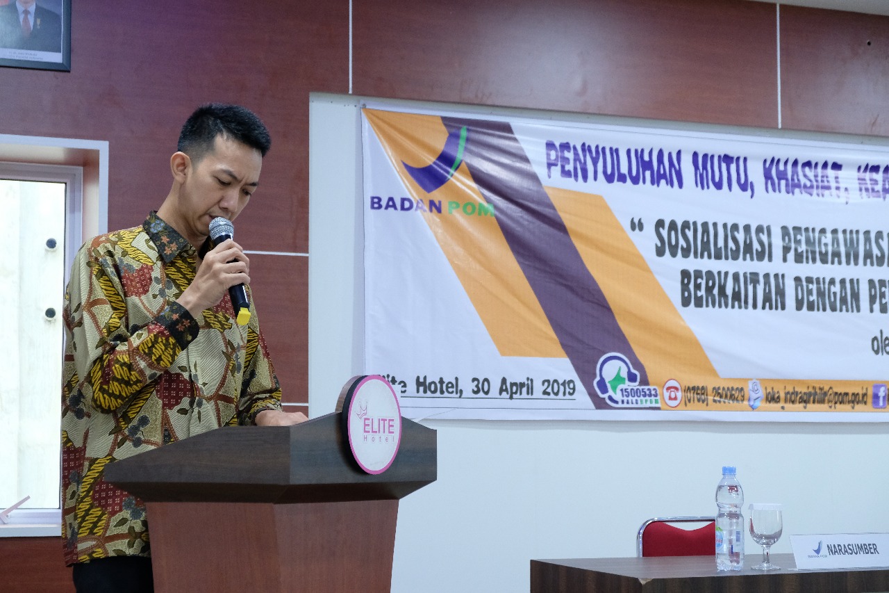 Seribuparitnews.com, Selasa, 30 April 2019, Kantor Badan POM di Kabupaten Indragiri Hilir melaksanakan penyuluhan Mutu, Khasiat, Keamanan Produk OMKABA dengan tema ”Sosialisasi Pengawasan Sediaan Farmasi oleh Kantor BPOM Kab Inhil Berkaitan dengan Pelayanan Kesehatan oleh Tenaga Kesehatan” di Hotel Elite, Jalan H. Said.