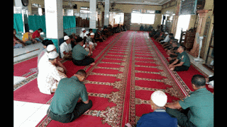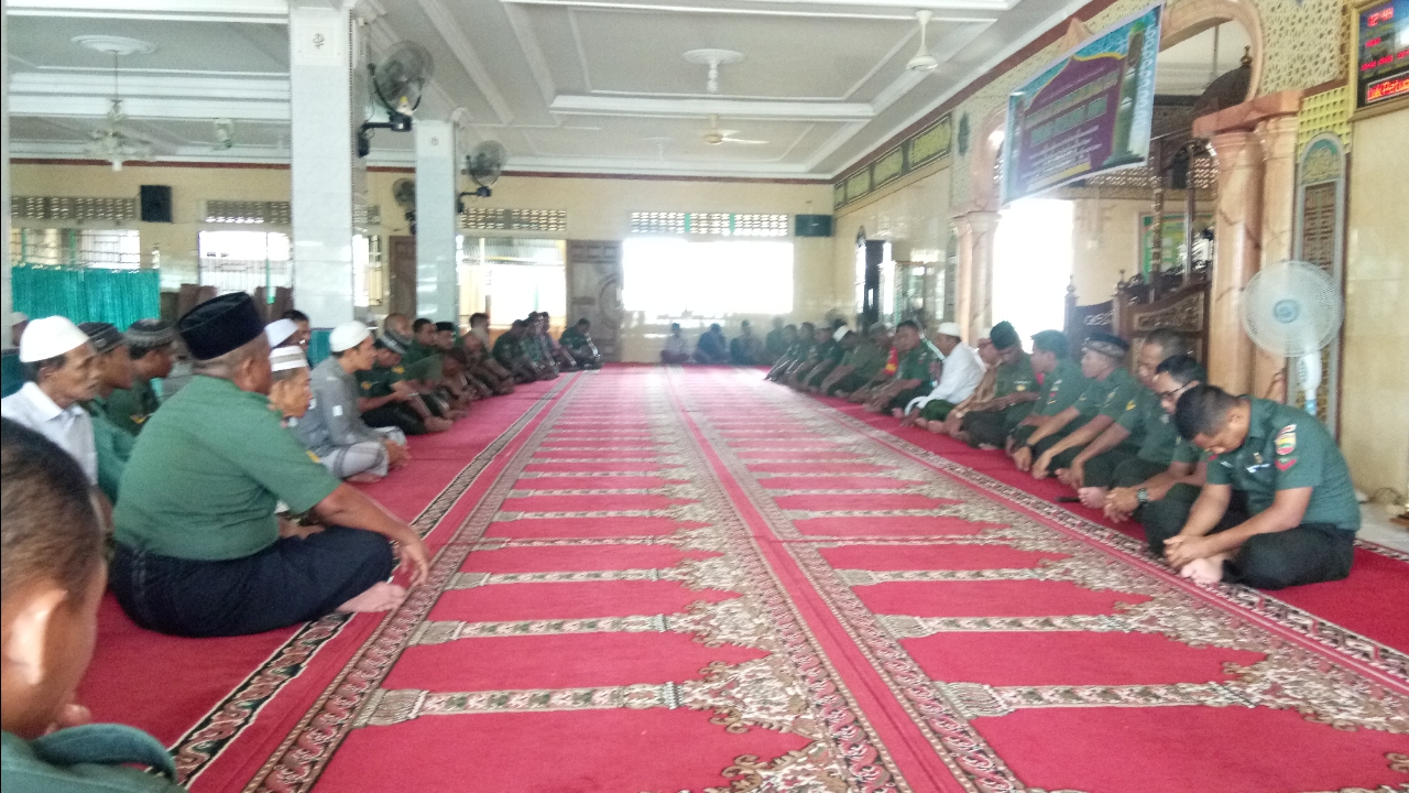 TEMBILAHAN - Sekitar 50 orang anggota Kodim 0314/Inhil, bersama warga sekitar Markas kodim menggelar sholat Dzuhur berjamaah di Masjid Ta'alimul Huda yang berada Jalan Sapta Marga, Tembilahan, Rabu (20/03/2019).