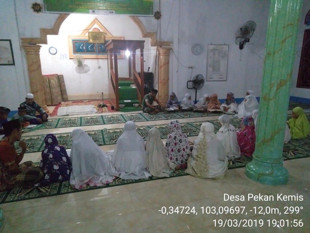 TEMBILAHANHULU :Babinsa Pekankamis Koramil 01/Tembilahan Serda Z.pulungan melaksanakan magrib mengaji di Masjid Baiturrahim RT 02 RW 01 Desa Pekankamis. Kegiatan dilaksanakan sebagai bagian dari Komsos kepada Masyarakat melalui peningkatan nilai nilai keagamaan.