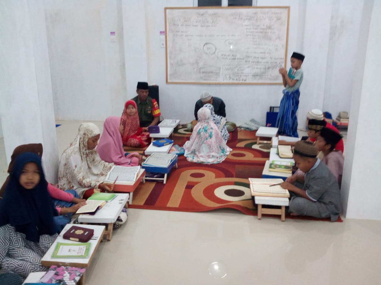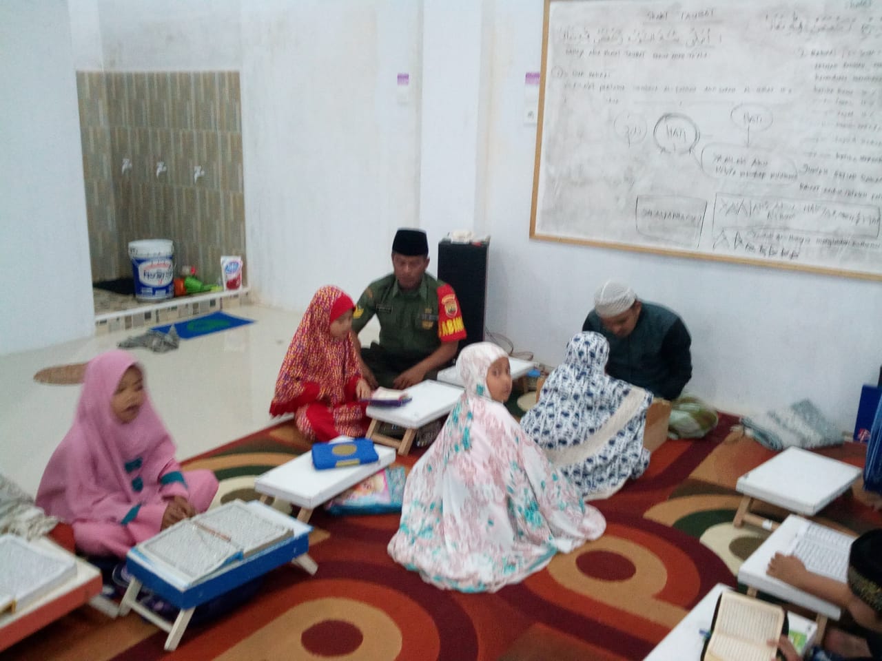TEMBILAHAN : Kamis Malam (14/03/019) Babinsa Kelurahan seberang Tembilahan Koramil 01/Tembilahan Serma Jaharzam melaksanakan mengajar mengaji di mushola Attaubah. RT02/RW 01 Kelurahan seberang Tembilahan, kegiatan tersebut didampingi Pengajar/pendamping Ustadz Solihin 25 tahun jumlah murid diberikan pelajaran mengaji sebanyak enam orang. menurut Ustadz Solihin Kegiatan mengaji bada magrib merupakan kegiatan rutin yang kami lakssanakan, dengan adanya Babinsa ikut mengajar mengaji ikut membantu kami selaku ustad di musholla ini. Dan juga program magrib mengaji merupakan program Pemerintah Daerah. Serda Jaharzam mengucapkan kepada murid murid di Musholla At Taubah yang antusias mengikuti pengajian ini. (ds)