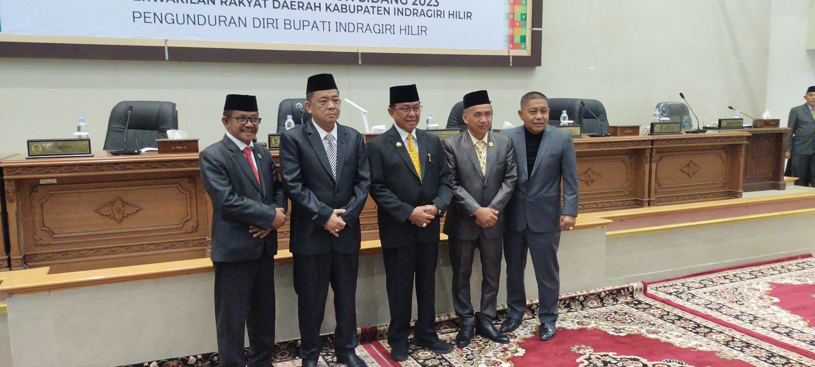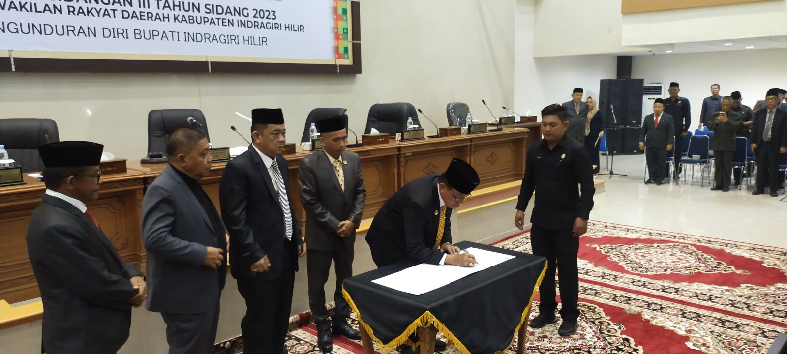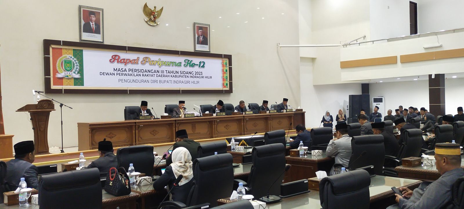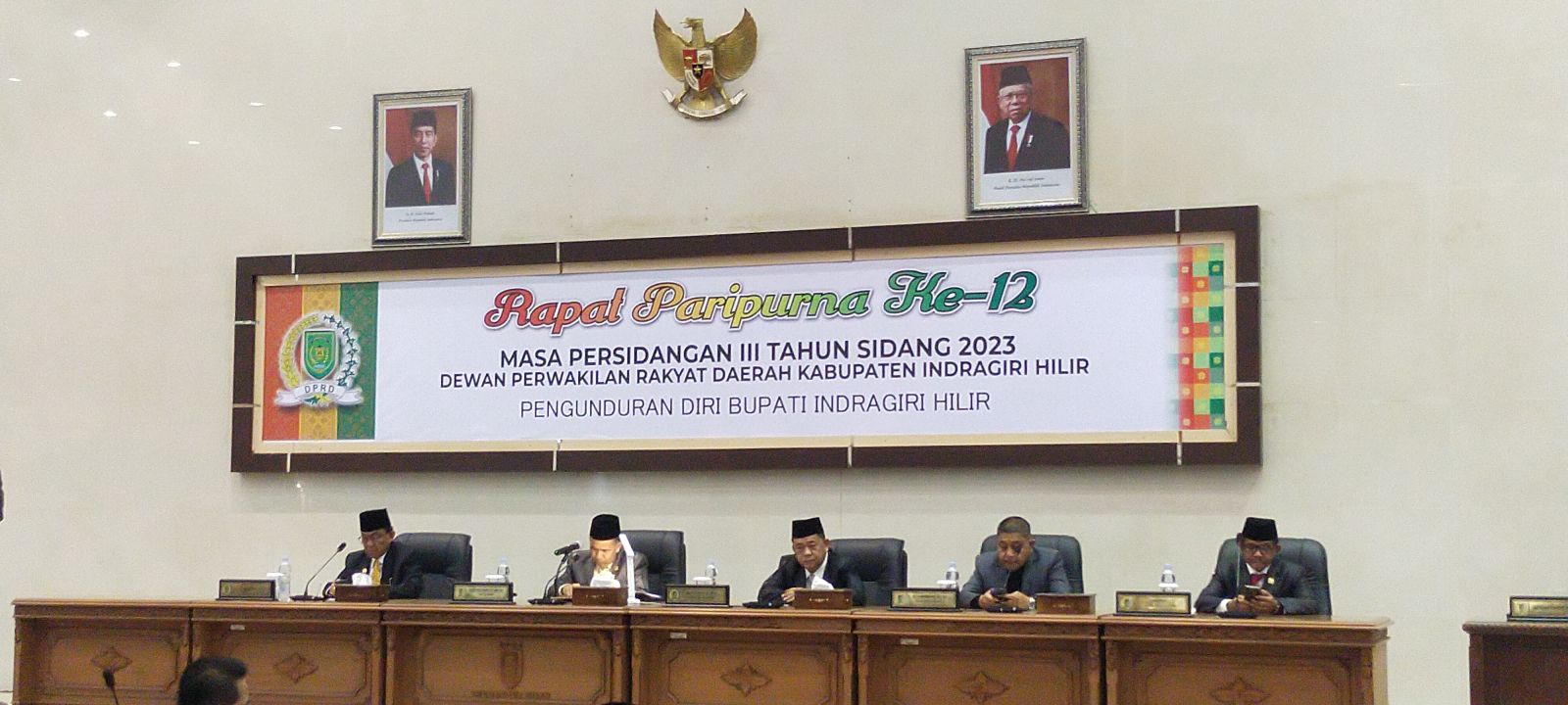 Disaksikan unsur Forkopimda dan Kepala OPD di lingkungan Pemkab Inhil serta tamu undangan lainnya, Rapat Paripurna dipimpin Ketua DPRD Dr. H. Ferryandi, ST., MM., MT yang didampingi para wakil ketua serta diikuti sejumlah Anggota DPRD Kab. Inhil, dengan agenda pengunduran diri Bupati Inhil dan penetapan perubahan keanggotaan Komisi dan Fraksi PBB, PAN dan Berkarya DPRD Kab. Indragiri Hilir.