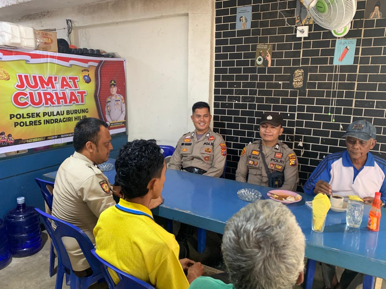 Pulau Burung – Personel Polsek Pulau Burung melaksanakan kegiatan Jum’at Curhat bersama masyarakat di Warung Alwis, Jalan Pendidikan, Desa Pulau Burung, Kecamatan Pulau Burung, Kabupaten Indragiri Hilir (Inhil), pada Jumat (31/10/2025) pagi. Kegiatan yang dimulai sekira pukul 09.00 WIB ini dihadiri oleh beberapa personel Polsek Pulau Burung dan sejumlah warga setempat.