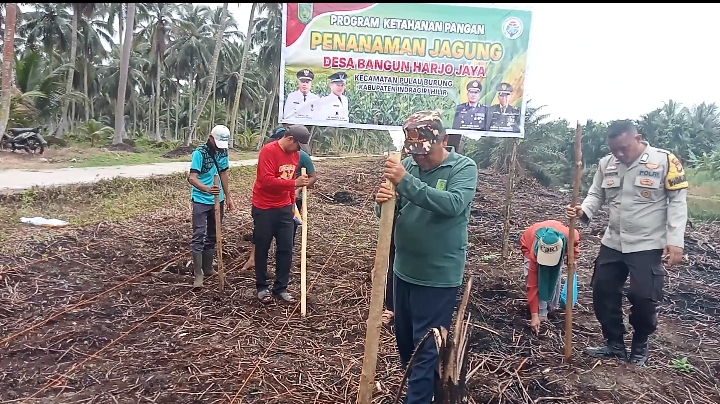 Pulau Burung — Pemerintah Desa Bangun Harjo Jaya terus menunjukkan komitmennya dalam mendukung ketahanan pangan lokal. Pada Senin, 11 Desember 2025, Pemdes bersama Polsek Pulau Burung dan sejumlah elemen masyarakat melaksanakan kegiatan penanaman jagung sebagai bagian dari program Swasembada Pangan 2025. Kegiatan ini berlangsung di KUT V Desa Bangun Harjo Jaya mulai pukul 08.30 WIB dan berjalan dengan dukungan penuh masyarakat desa.