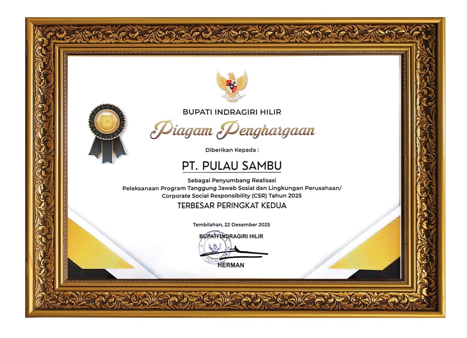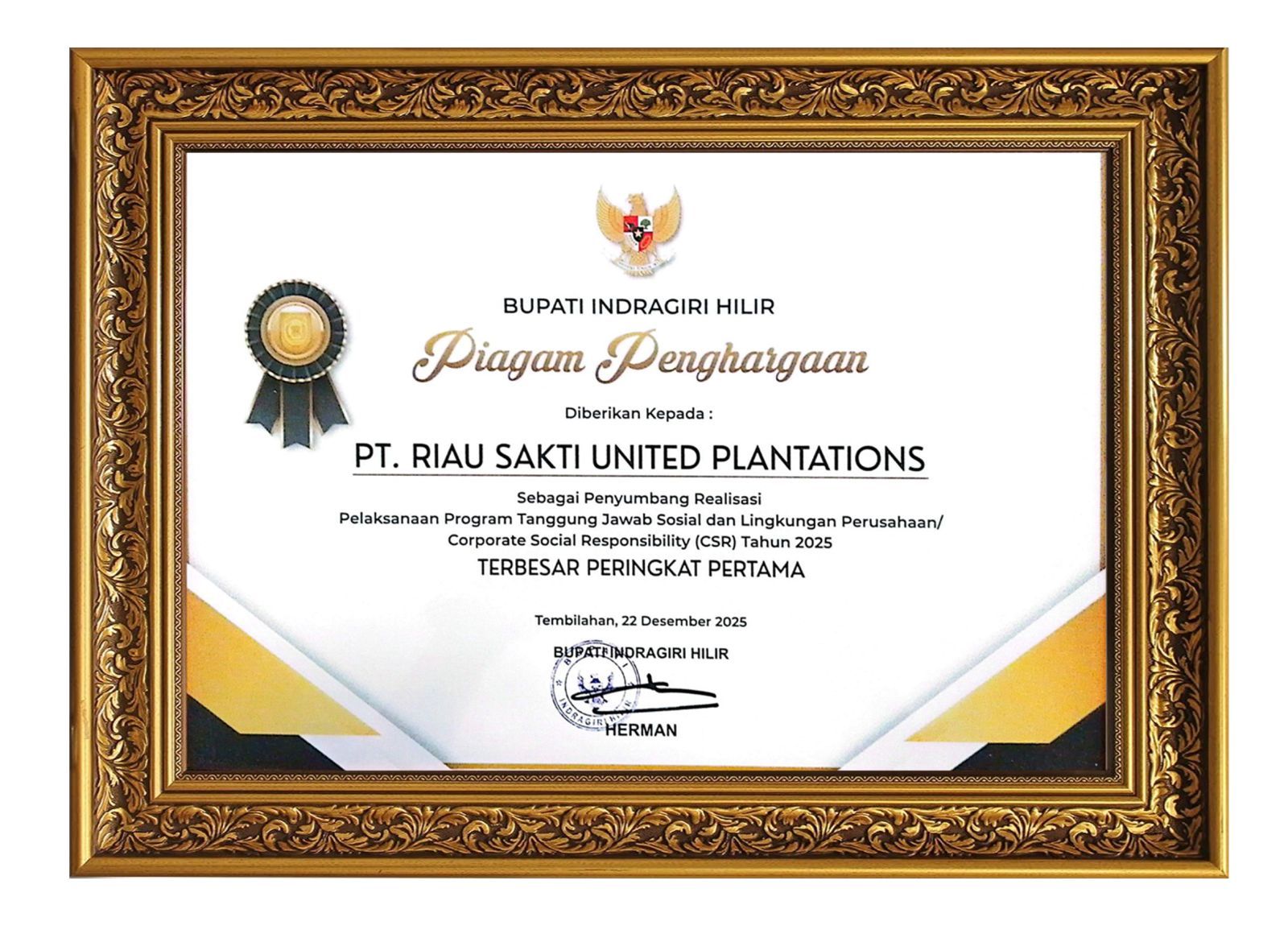 Penghargaan tersebut diberikan kepada PT Riau Sakti United Plantations sebagai peringkat pertama penyumbang realisasi CSR terbesar, serta PT Pulau Sambu sebagai peringkat kedua. Penghargaan ini diserahkan langsung oleh Bupati Kabupaten Indragiri Hilir, H. Herman dalam rangkaian acara peresmian sekaligus launching Mal Pelayanan Publik (MPP) Kabupaten Indragiri Hilir yang berlangsung di Gedung MPP, Tembilahan, pada Senin, 22 Desember 2025.