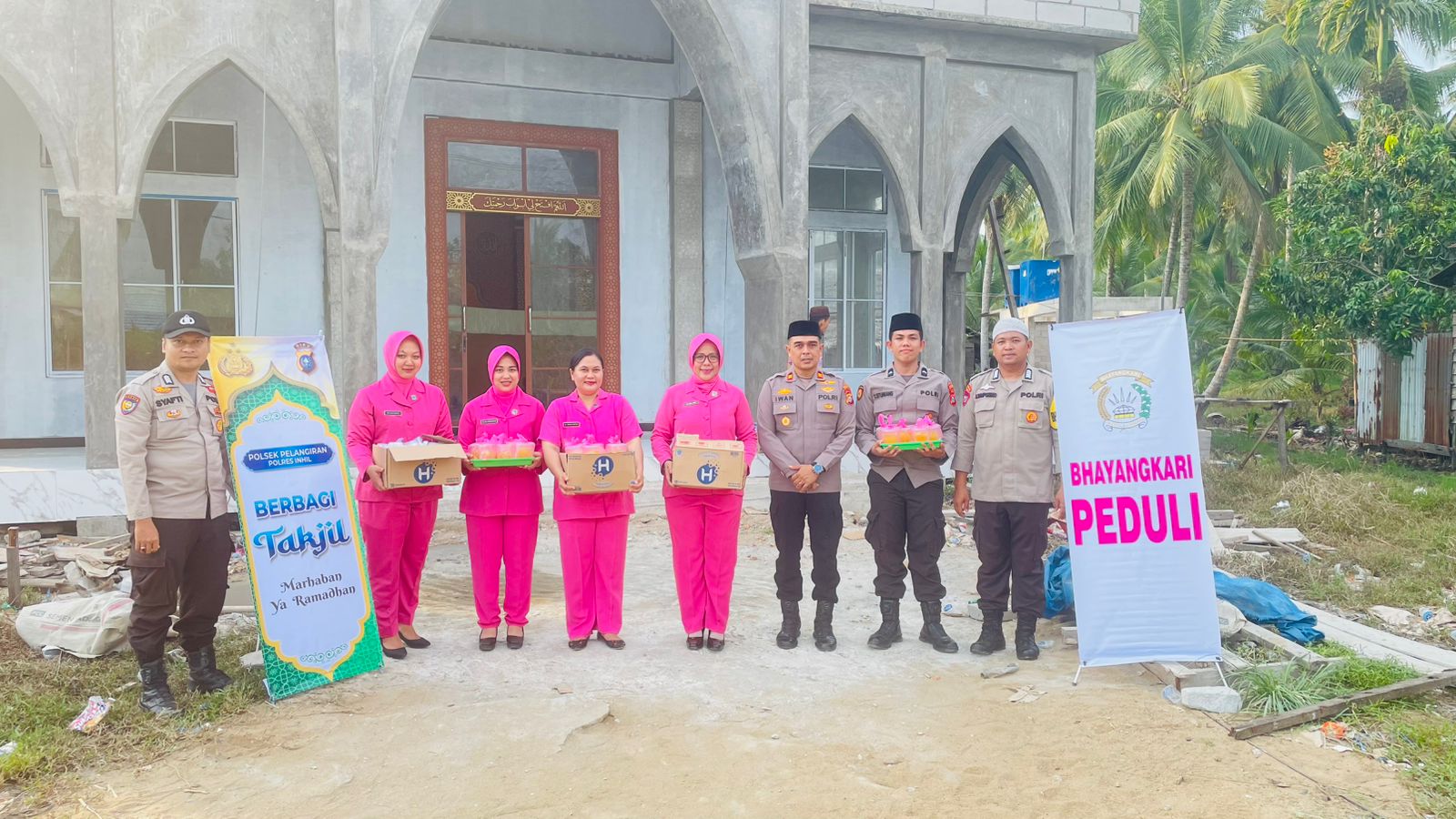 Kapolsek Pelangiran IPTU IWAN SAPUTRA, S.H., M.H. didampingi Ketua Bhayangkari Ranting Pelangiran Ny. DIAH IWAN melaksanakan kegiatan pembagian takjil gratis kepada pengurus musholla dan warga setempat, Minggu (1/4/2026) sore. Kegiatan tersebut berlangsung di halaman Mushalla Baiturrahman, Jalan H. Hasan, Kelurahan Pelangiran, Kecamatan Pelangiran.