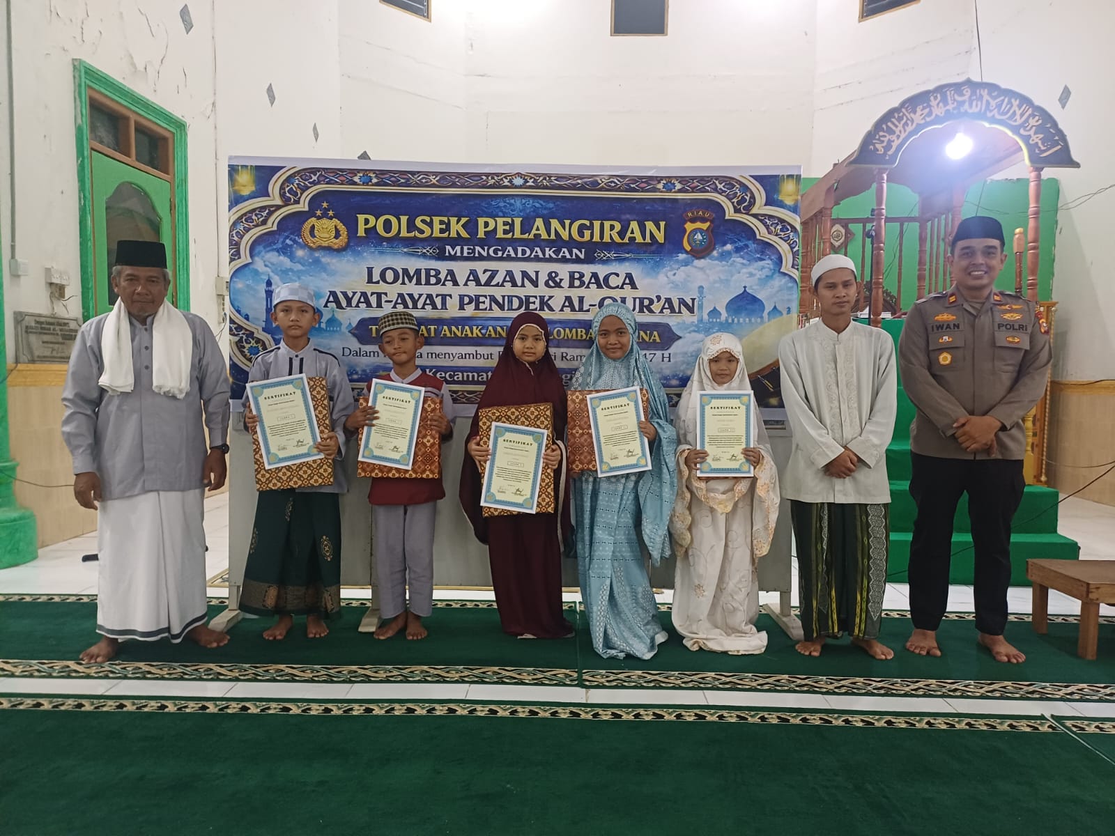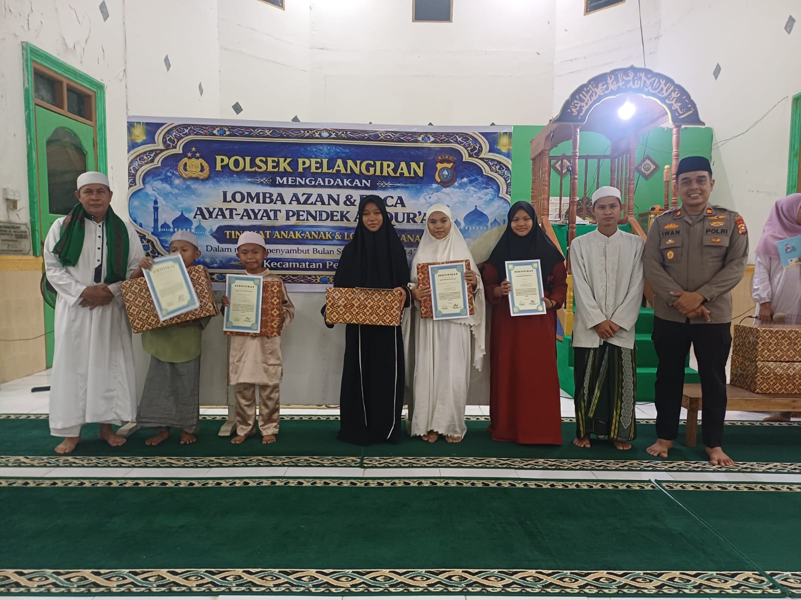 Pelangiran - Kapolsek Pelangiran, Iwan Saputra, secara resmi menutup kegiatan lomba adzan dan hafalan surat pendek tingkat anak-anak yang diselenggarakan oleh Polsek Pelangiran. Penutupan sekaligus pembagian hadiah kepada para pemenang tersebut dilaksanakan pada Sabtu malam, 14 Maret 2025 sekitar pukul 21.30 WIB di Masjid Al Mujahidin Pelangiran, Kelurahan Pelangiran.