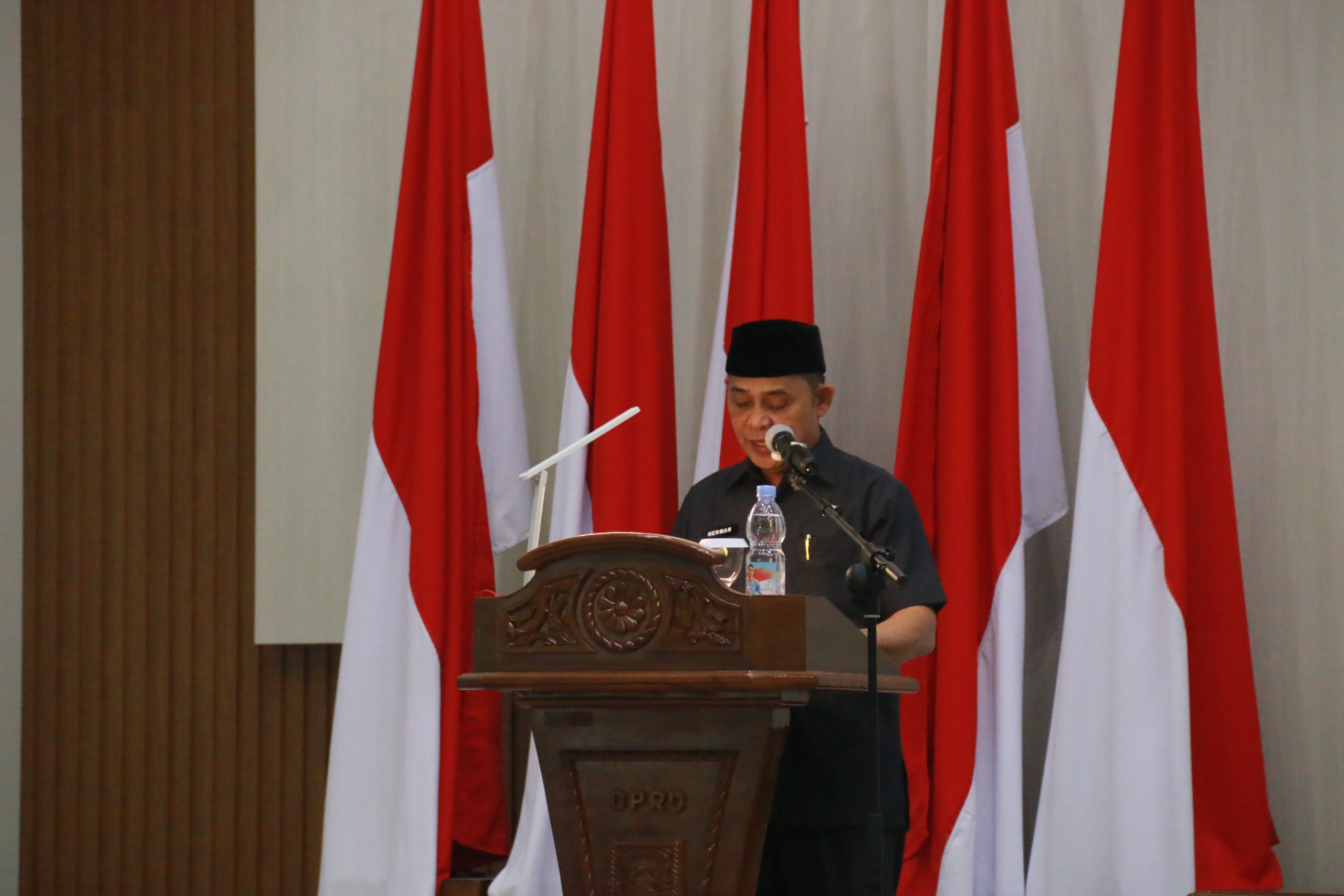 Dalam penyampaiannya, Bupati Herman memaparkan capaian kinerja pemerintah daerah serta menyoroti kondisi keuangan daerah, khususnya terkait defisit anggaran dan pengelolaan belanja.
