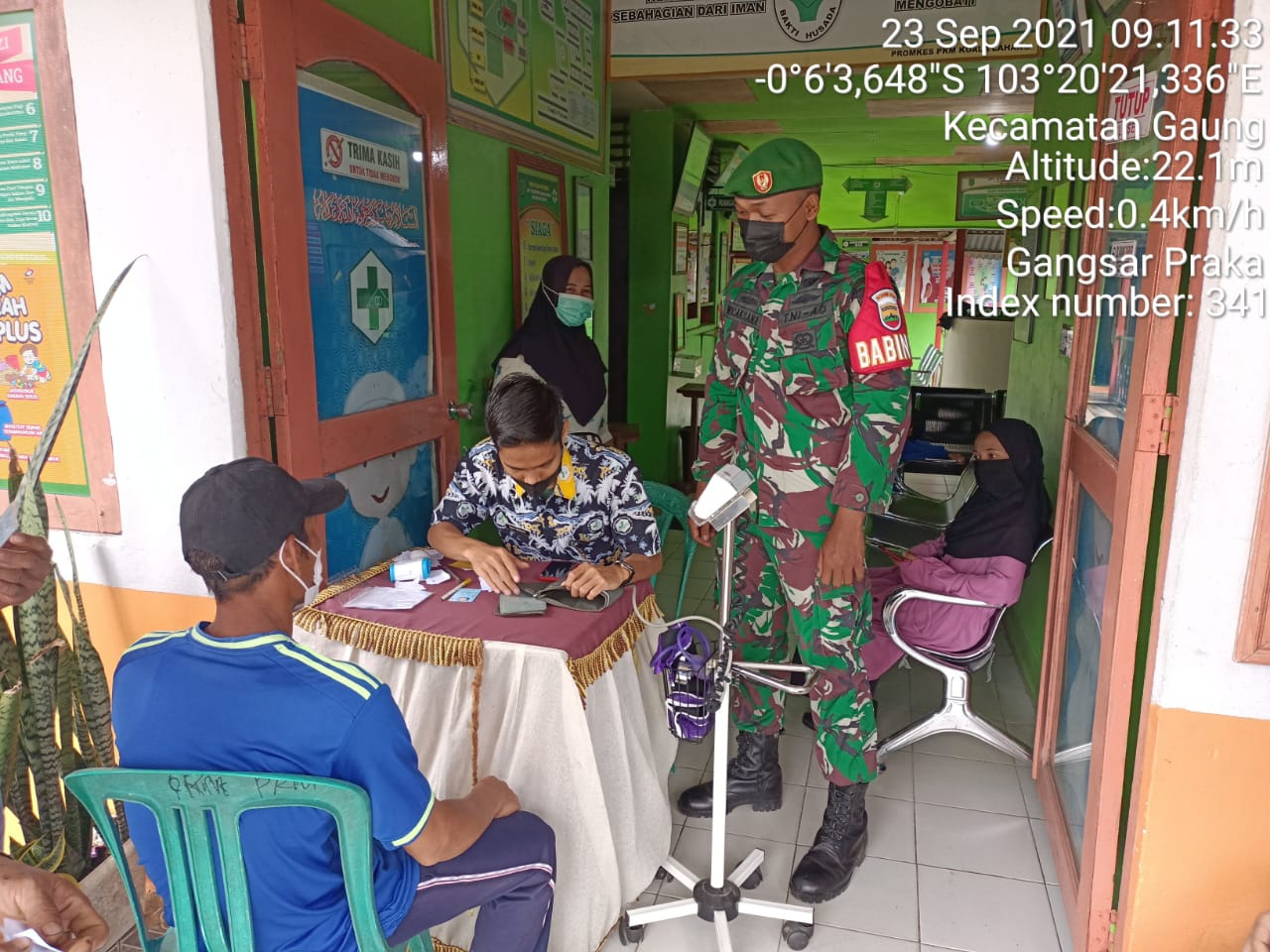 SERIBUPARITNEWS.COM, GAUNG - Sebagai bentuk dukungan Apter dalam serbuan Vaksinasi pencegahan terhadap covid-19 di wilayah Kecamatan Gaung , Babinsa Koramil 05/Gas, Praka Gangsar melaksanakan pendampingan vaksinasi di Kelurahan Kuala Lahang Kecamatan Gaung Kamis (23/09/2021)