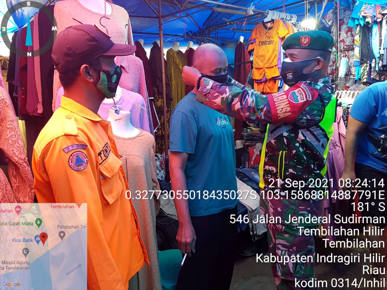 SERIBUPARITNEWS.COM,TEMBILAHAN - Serda Anton  Babinsa Koramil 01/Tembilahan Kodim 0314/Inhil  melaksanakan Penegakan Disiplin di Pasar  Pos Air Mancur Selasa (21/09/2021)
