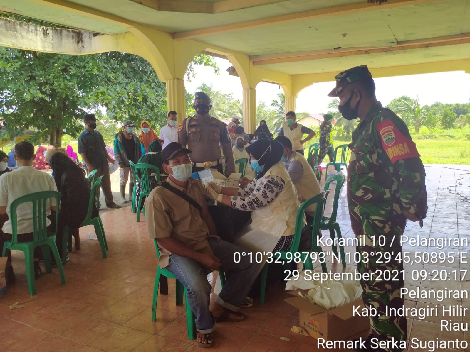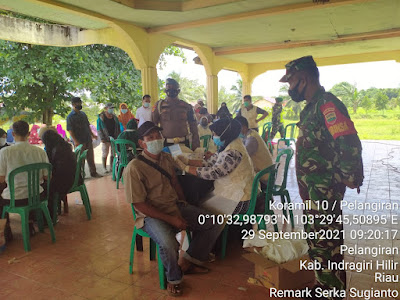 SERIBUPARITNEWS.COM, PELANGIRAN - Babinsa Koramil 10/Pelangiran Kodim 0314/Inhil melaksanakan kegiatan Pendampingan penyuntikan Vaksin Sinovac Senin (20/09/2021)