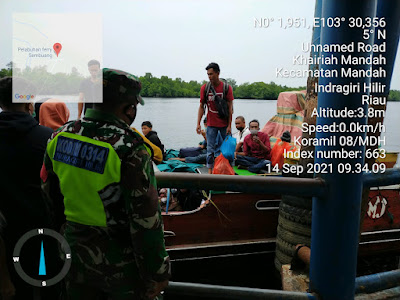 Sertu Haris Mony Babinsa Koramil 08/Mandah Kodim 0314/Inhil Mengecek Penerapan Protokes Terpadu  di Pelabuhan Sembuang  kepada penumpang dan warga setempat Selasa   (14/09/2021)