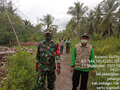 Babinsa melaksanakan patroli karhutlah di areal perkebunan milik warga di Jalan Penghubung Desa Baung Rejo Kecamatan Pelangiran Kab.Inhil.