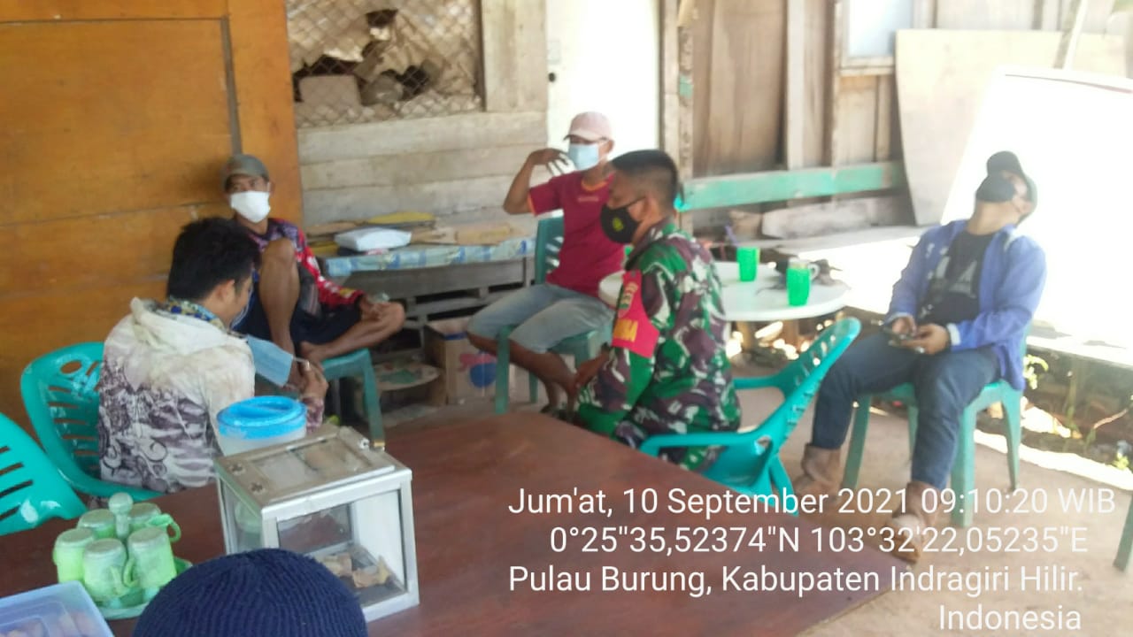 Serda Arlansyah  Babinsa Koramil 11/Pulau Burung Kodim 0314/Inhil Fokuskan Penegakkan Disiplin  Kepada warga yang berkumpul di salah satu kedai kopi Jumat (10/08/9/2021)