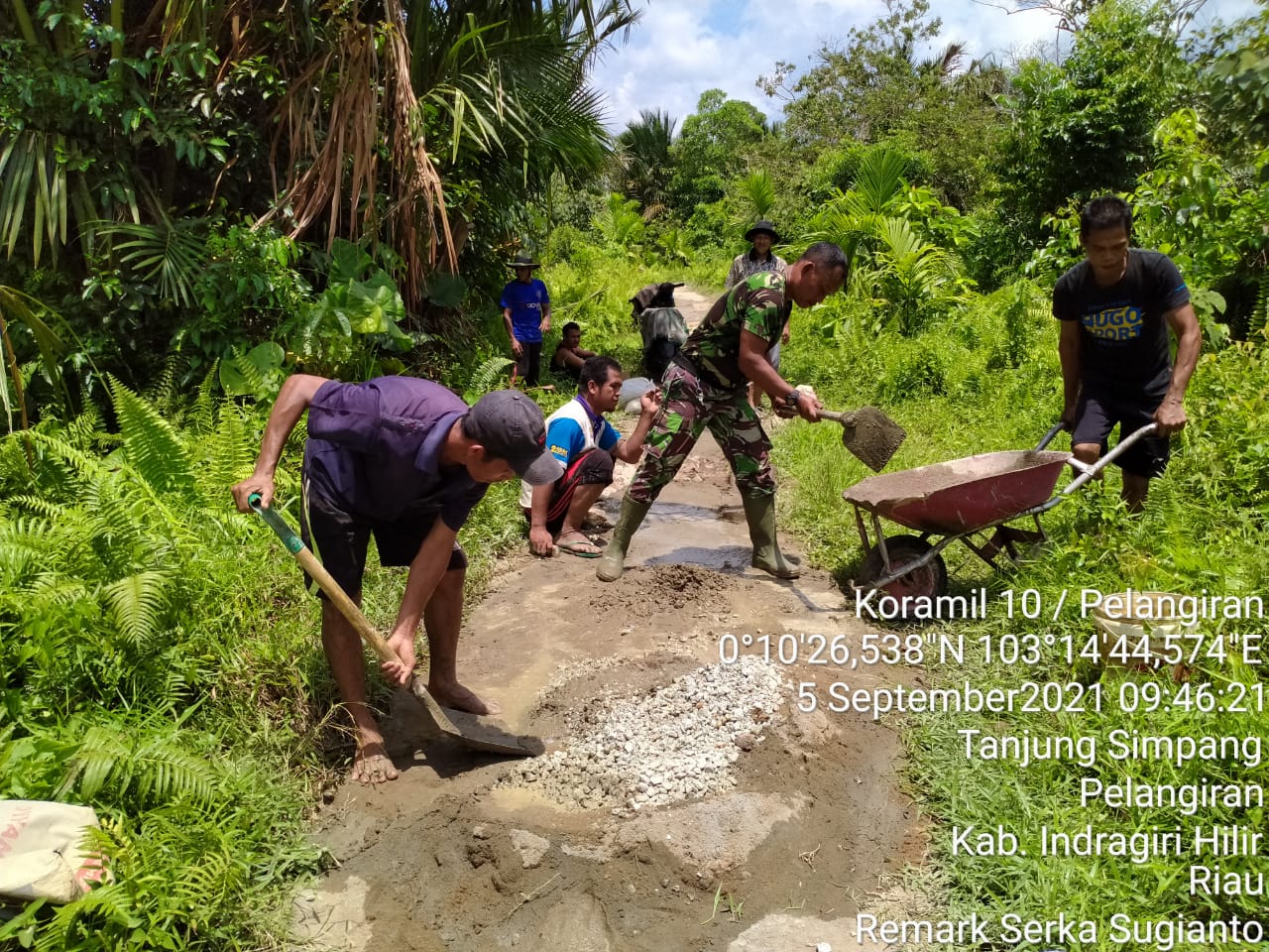 SERIBUPARITNEWS.COM, PELANGIRAN - Guna mengisi kegiatan di hari Minggu, Serka Sugianto Babinsa Koramil 10/Pelangiran Gerakkan Warga Bergotong Royong (05/09/2021)