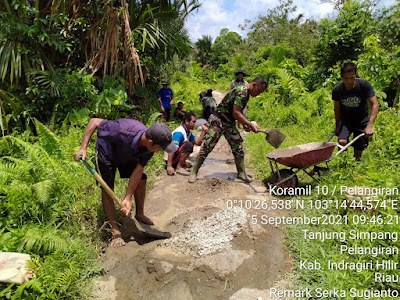 Gotong royong dilaksanakan bersama warga melaksanakan perbaikan jalan penghubung desa menuju ke PT THIP desa Tanjung Simpang Kecamatan Pelangiran kab. Inhil.