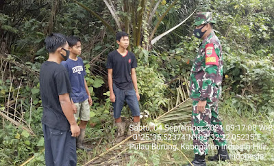 SERIBUPARITNEWS.COM, PULAUBURUNG - Sebagai Upaya penanggulangan Kebakaran Hutan dan lahan, Babinsa Koramil 11/Pulau Burung Serda Arlansya  dan warga setempat melaksanakan kegiatan  patroli Karhutlah Sabtu  (04/09/2021)