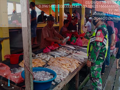 Dalam penegakkan disiplinnya Babinsa menghimbau agar para pedagang dan pembeli memakai masker dan menjaga jarak agar terhindar dari penularan Covid -19