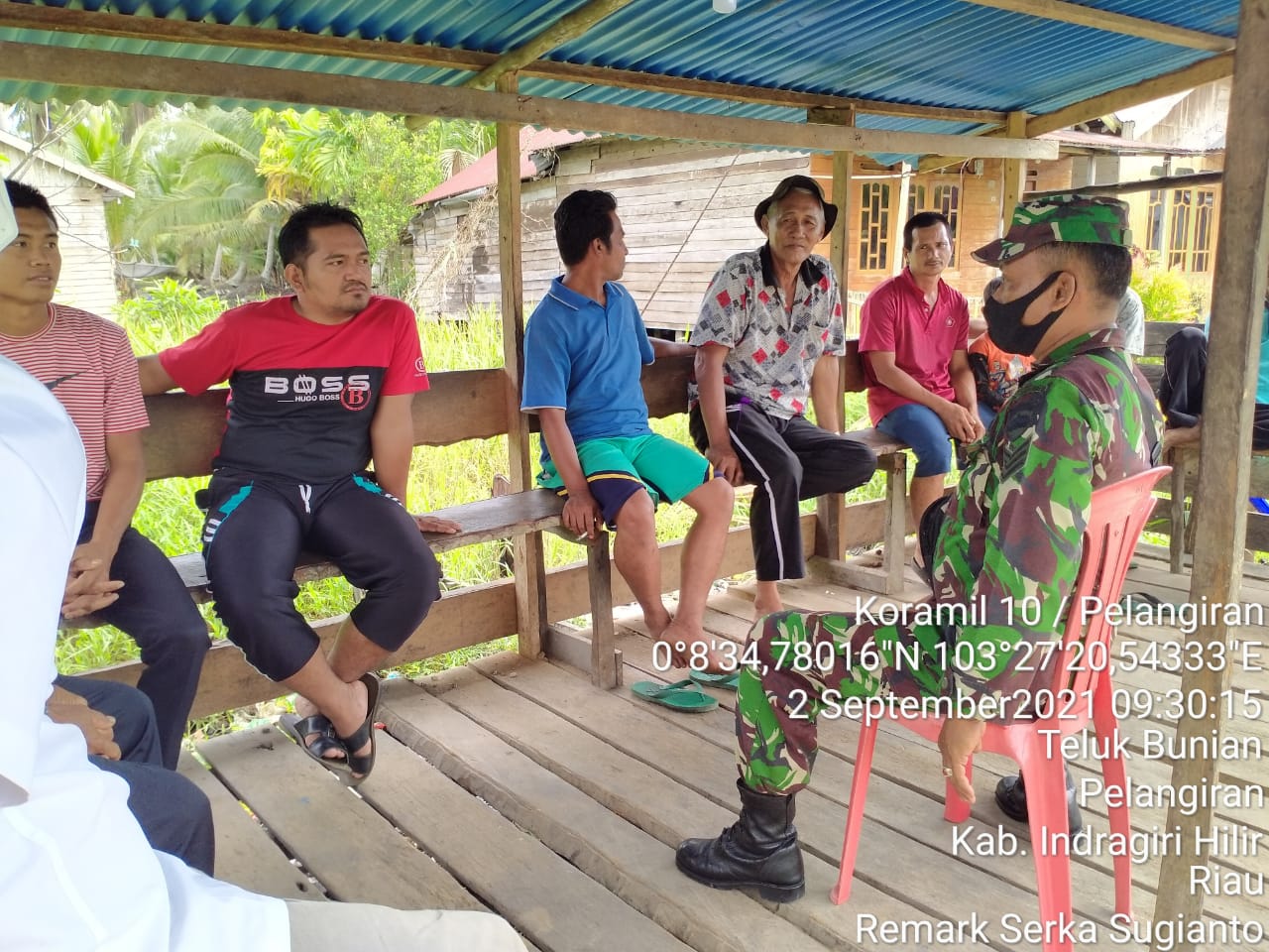 SERIBUPARITNEWS.COM, PELANGIRAN - Sebagai upaya dalam penegakkan disiplin, Minggu inin Babinsa 10/Pelangiran Serka Sugianto melaksanakan Komsos dan Himbauan Protokes dengan warga masyarakat Kamis   (02/09/2021)