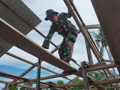 Babinsa bersama pak Aknan pemilik rumah bahu membahu memasang atap seng rumah dengan berlahan lahan