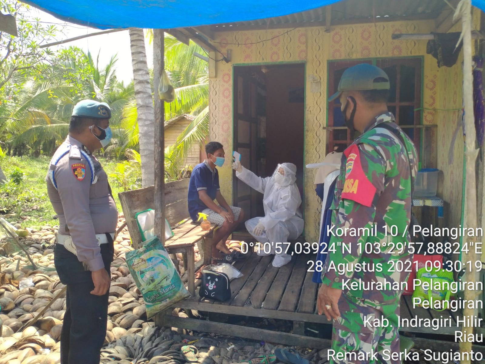 Serka Sugianto Babinsa Koramil 10/Pelangiran Kodim 0314/Inhil Melaksanakan Tracking, Treatment dan Test PCR (3T) kepada warga yang kontak erat dengan pasien terpapar Covid-19 Sabtu (28/08/2021)