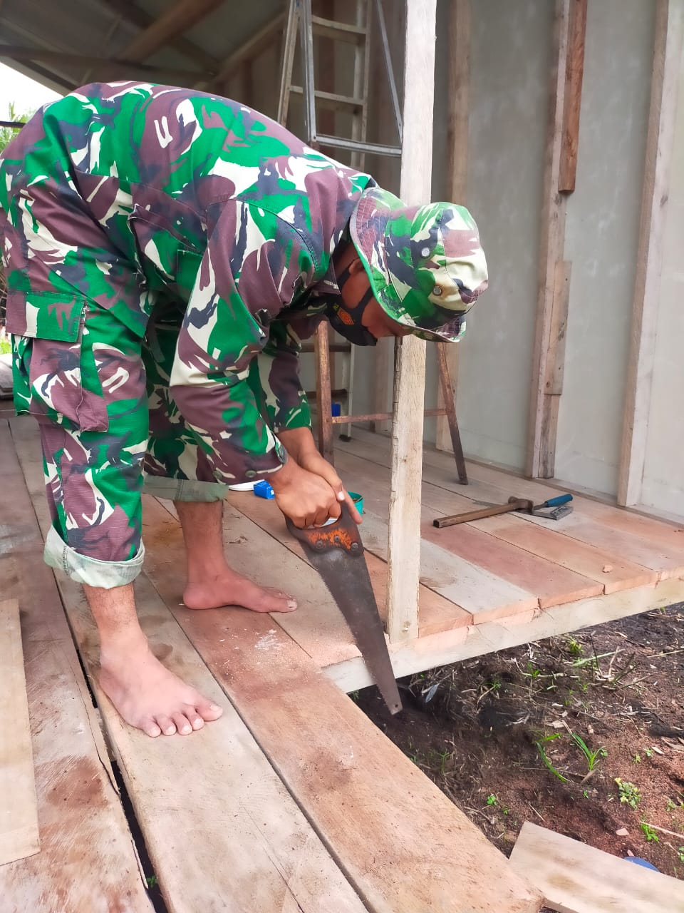 Serda Tulus Lumban Gaol Babinsa Koramil 08/Mandah Kodim 0314/Inhil meneruskan Pelaksanaan Pekerjaan Rumah Tidak layak Huni
