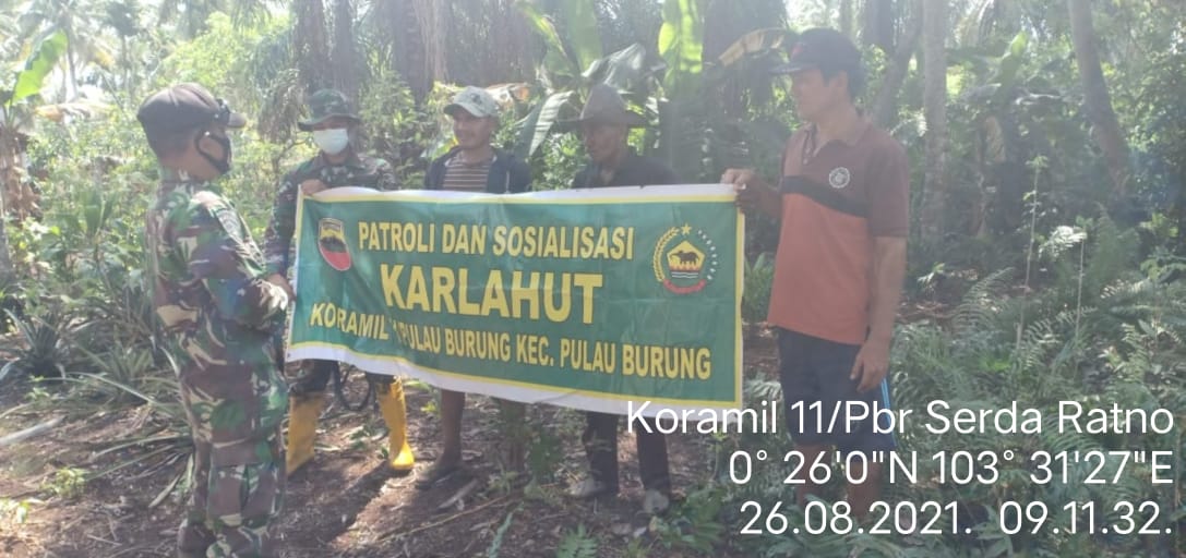 SERIBUPARITNEWS.COM, Babinsa Koramil 11/Pulau Burung Kodim 0314/Inhil Serda Suratno bersama rekannya melaksanakan Kegiatan patroli dan sosialisasi karhutla di Desa Sungai Danai dan Teluk Nibung Kecamatan Pulau Burung Kab Inhil Kamis (26/08/2021)