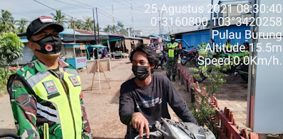 SERIBUPARITNEWS.COM, PULAUBURUNG - Demi menerapkan Protokol kesehatan di Wilayah Koramil 11 Pulau Burung Kodim 0314/Inhil, Serda Siswanto bersama Tim Gugus Melaksanakan Pengecekan Penerapan Protokes Rabu (25/08/2021)