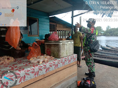 Seperti Serda Erik Arianto Babinsa Koramil 10/Pelangiran Melaksanakan penerapan Protokes di Pasar Pelabuhan Pelangiran di Kelurahan Pelangiran Kecamatan Pelangiran Selasa (24/08/2021)