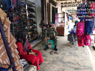 Babinsa menghimbau tetap memakai masker dan menjaga jarak  kepada pengunjung dan pedagang di pasar