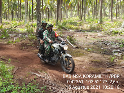 Sertu Yanuarsyah Babinsa Koramil 11/Pulau Burung Kodim 0314/Inhil Bersama terus berupaya melaksanakan Patroli dan sosialisasi pencegahan karhutlah di wilayah binaannya Minggu (15/08/2021)