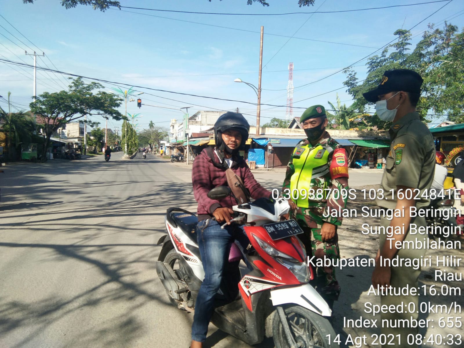 SERIBUPARITNEWS.COM, TEMBILAHAN - Masa dalam kondisi dan situasi pembatasan Mobilitas Warga, Sertu Syafriadi Koto Babinsa Koramil 01/Tembilahan Serda Adr terus melaksanakan Upaya Pencegahan dengan melaksanakan Penegakkan disiplin Sabtu (14/08/2021)