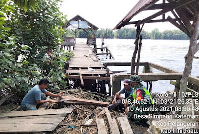 Babinsa Desa Simpang Kateman, Serda Dodi Eka putra.melaksanakan Gotong royong bersama warga RT 04 melaksanakan Penggantian Papan Pelantar ke Pelabuhan yang sudah Rusak di RT 04 Selasa (10/08/2021)