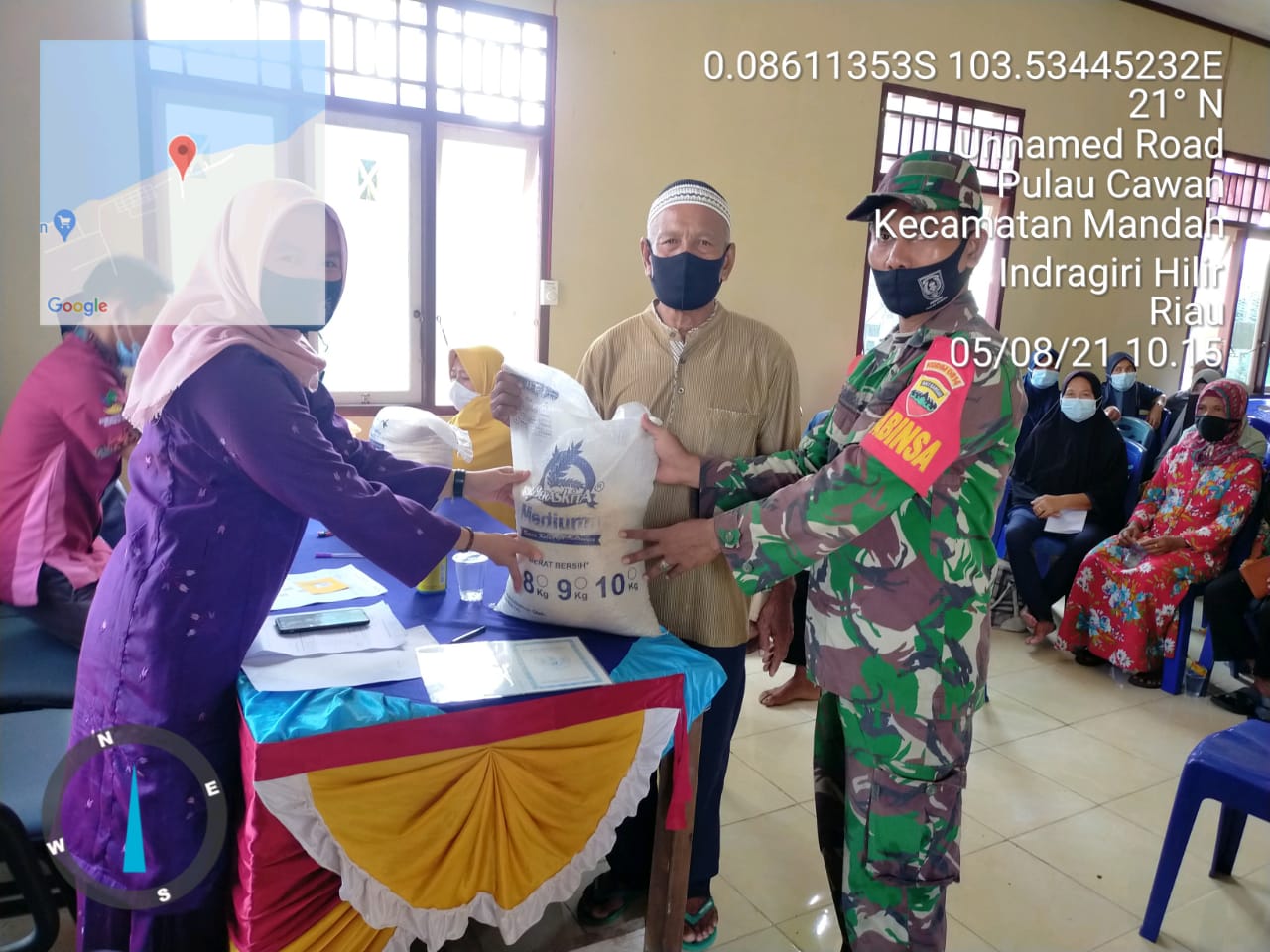 SERIBUPARITNEWS.COM, MANDAH - upaya dalam membantu tim dalam penyaluran Bantuan, Babinsa Koramil 08/Mandah Kodim 0314/Inhil Serda Tulus L.Gaol melaksanakan pengawasan penyaluran Bantuan Beras BB/PPKM Kamis (05/08/2021)