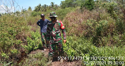 Babinsa Koramil 11/Pulau Burung Kodim 0314/Inhil Serda Siswanto Tetap sigap melaksanakan kegiatan patroli dan sosialisasi karhutla bersama warganya Kamis (05/08/2021)