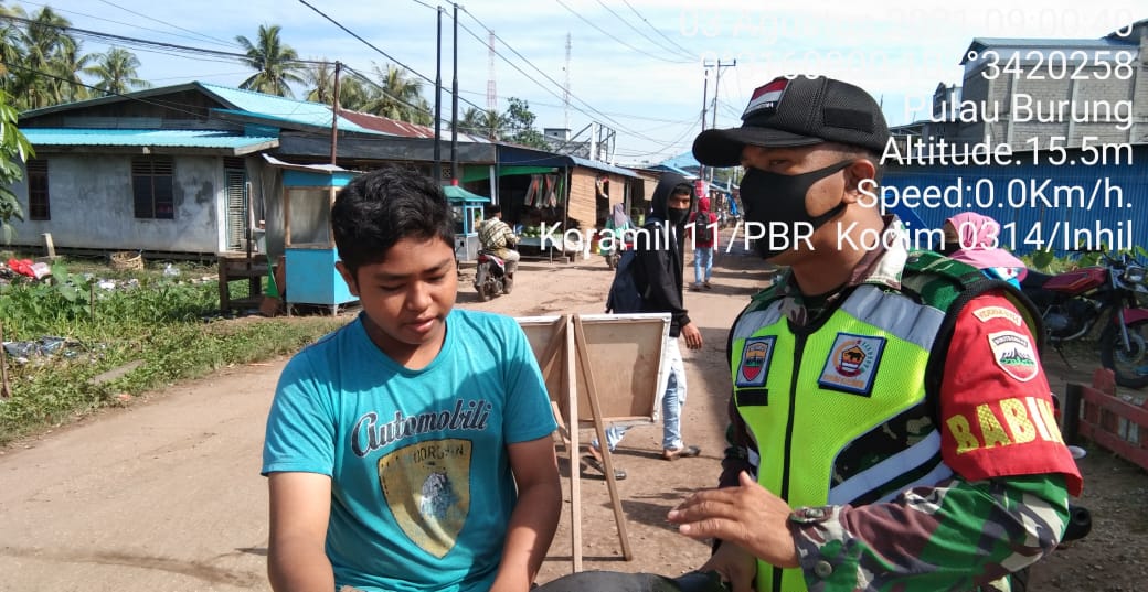SERIBUPARITNEWS.COM, PULAUBURUNG - Sebagai Upaya dalam Menerapkan Protokol kesehatan, Babinsa Koramil 11/PBR Serda Siswanto melaksanakan Kegiatan Penegakkan Disiplin Protokol Kesehatan Covid-19 Selasa (03/08/2021)