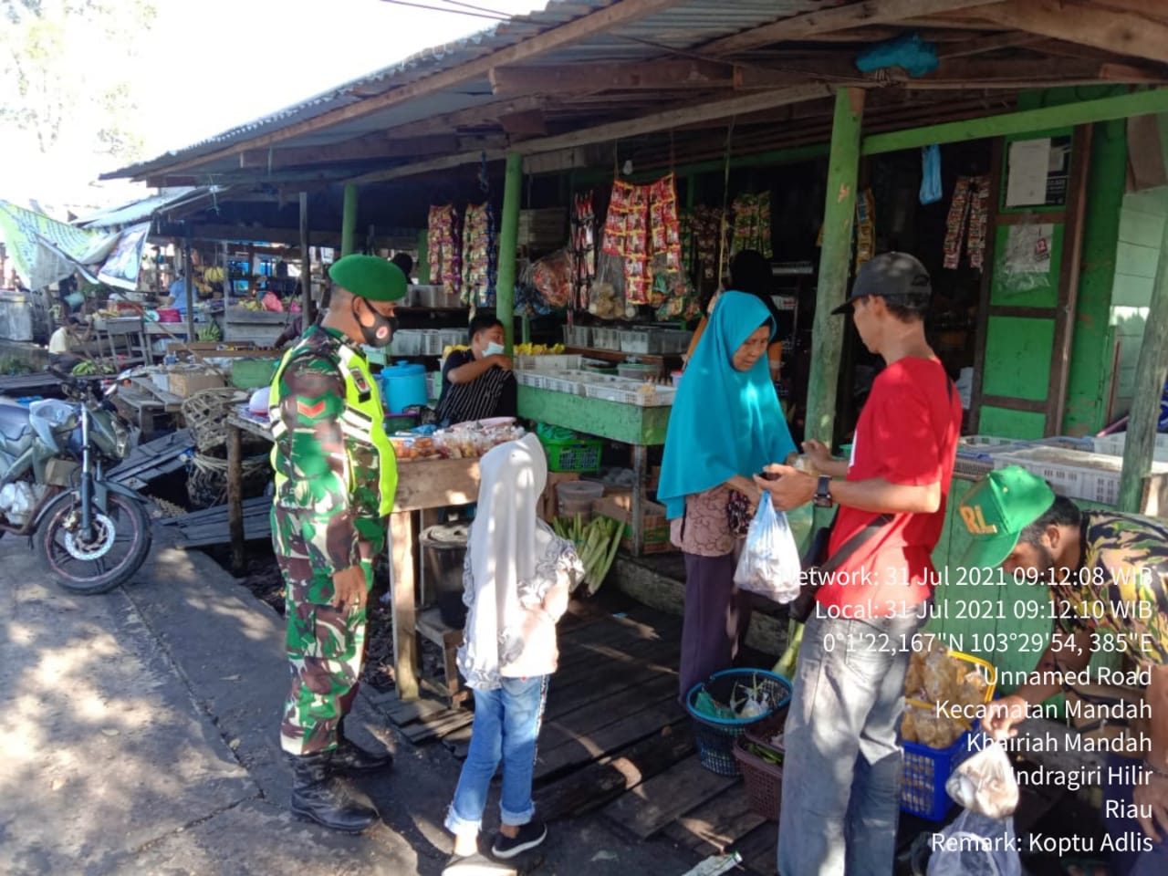 SERIBUPARITNEWS.COM, MANDAH - Dalam upaya penegakkan disiplin protokol kesehatan pelaksanaannya tidak hanya di jalan, tetapi dapat juga dilakukan di pasar, Seperti Hari ini Babinsa Koramil 08/Mandah Kodim 0314/Inhil Koptu Adlis melaksanakan penegakan disiplin protokol kesehatan kepada warga yang berbelanja Sabtu (31/07/2021)