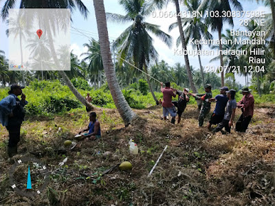 Gotong royong yang dilaksankan berupa penebangan pohon kelapa yang menghalangi jalur kabel listrik dari jaringan Tembilahan menuju Desa Bantayan Kecamatan Mandah Kab.Inhil.
