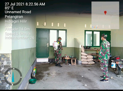 SERIBUPARITNEWS.COM, PELANGIRAN - Sebagai upaya dalam mensterilkan Wilayah Seputaran Kantor Koramil 10/Pelangiran  dalam pencegahan Covid -19, Dipimpin Pjs. Danramil Pelda Wagianto  Personil Koramil 10/Pelangiran  Melaksanakan penyemprotan Disinfektan Semalam Selasa (27/07/2021)
