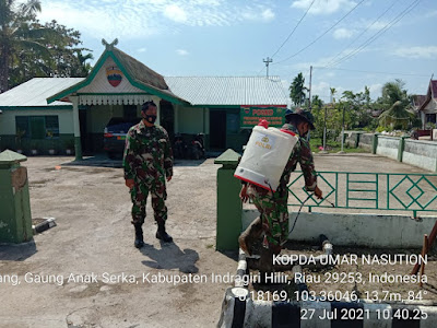 SERIBUPARITNEWS.COM,MANDAH - Upaya dalam menjaga sterilisasi Kantor Koramil 05/Gas dari Penyebaran dan Infeksi Covid -19, Danramil 05/Gas  Lettu Selamet H Pimpin Penyemprotan Desinfektan Selasa (27/07/2021)