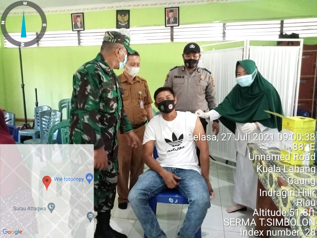 SERIBUPARITNEWS.COM, GAUNG ANAK SERKA - Sebagai bentuk dukungan Apter dalam pencegahan terhadap covid-19, Babinsa Koramil 05/Gas, Serma  Tota melaksanakan pendampingan vaksinasi bersama babinkamtibmas Selasa (27/07/2021)
