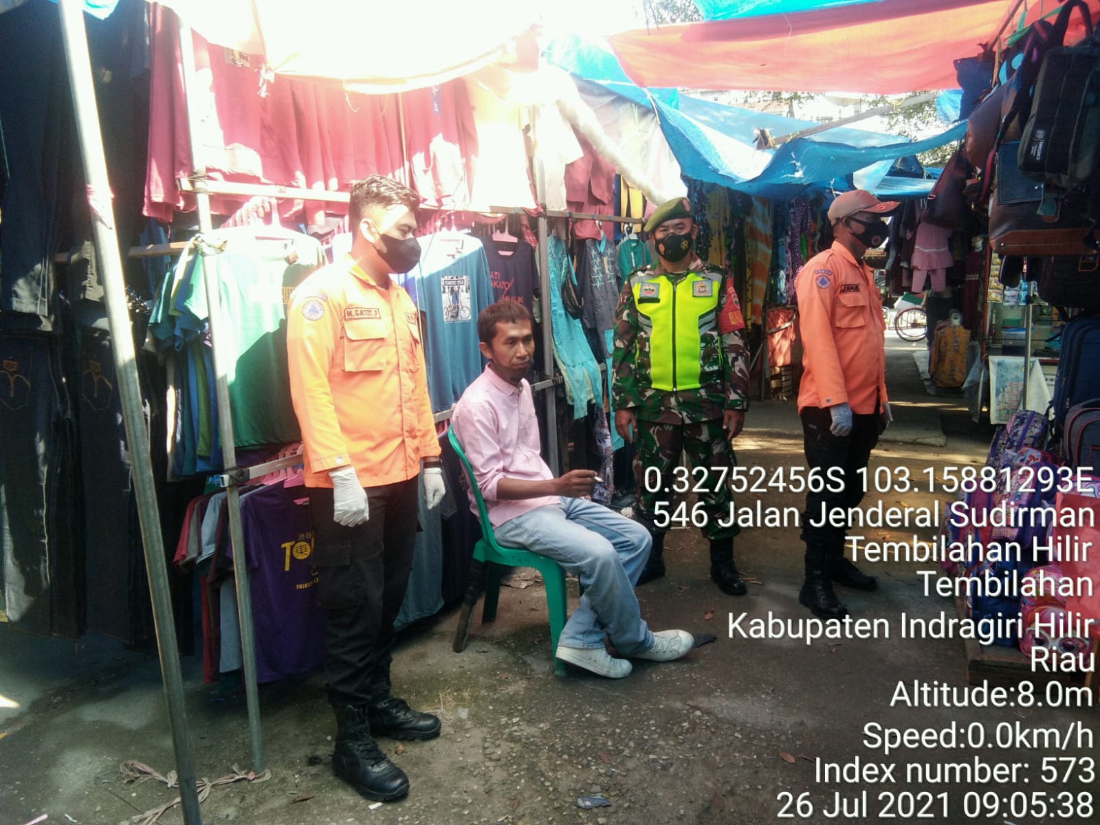 SERIBUPARITNEWS.COM,TEMBILAHAN - Sertu Syafriadi Koto Babinsa Koramil 01/Tembilahan Kodim 0314/Inhil Melaksanakan Penegakkan disiplin protokol kesehatan di Pos Air mancur di Kel. Tembilahan kota Kecamatan Tembilahan Kab. Inhil Senin (26/07/2020/1)