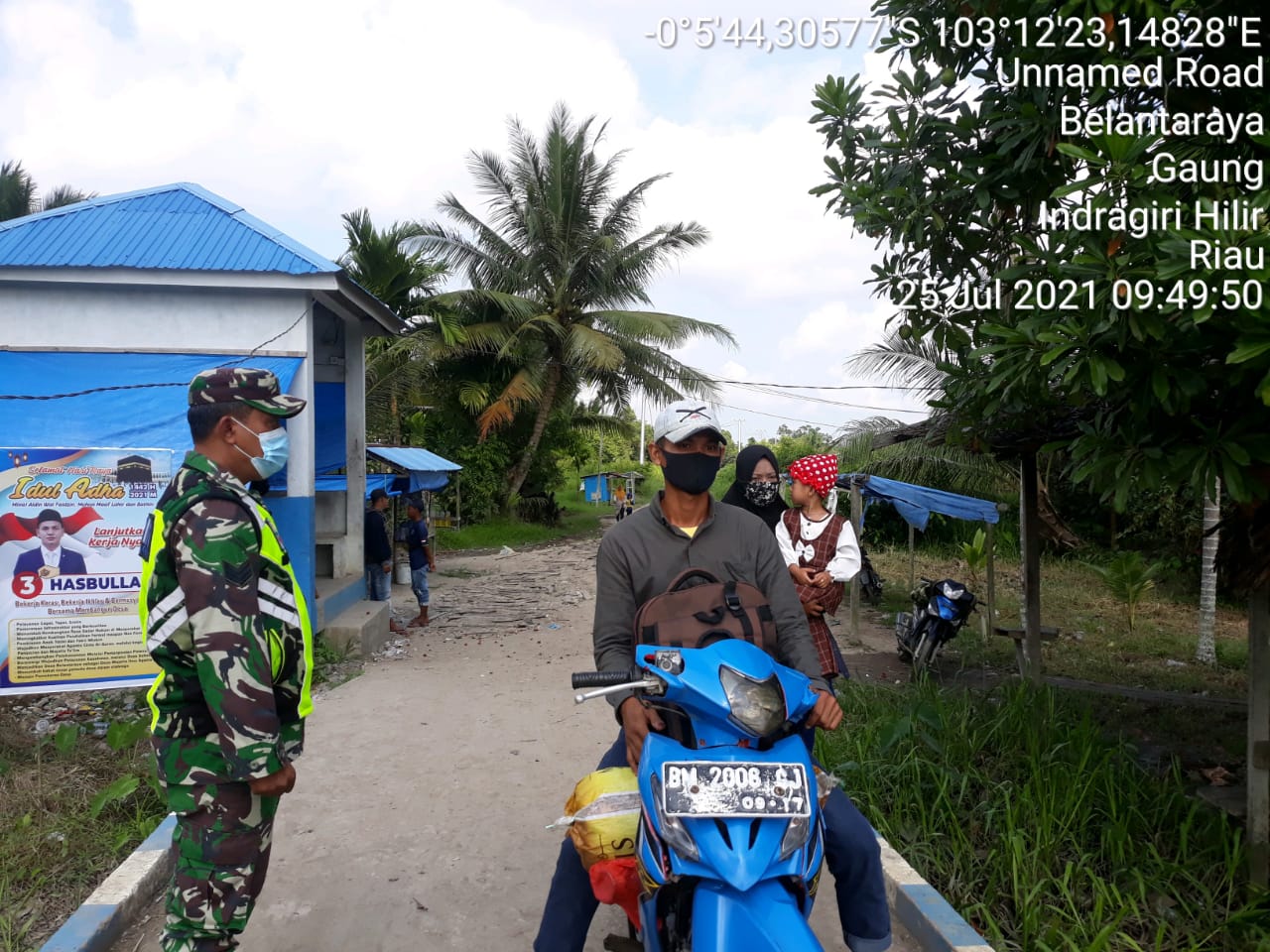 SERIBUPARITNEWS.COM,GAUNG - Sebagai bentuk tugas dan peran Pembina Wilayah dalam menerapkan Protokol Kesehatan, Hari ink Babinsa Koramil 05/Gas, Serka  Sasmito Melaksanakan penegakan disiplin  protokol kesehatan kepada warga yang melintas di Pelabuhan Penyeberangan di Desa Belantaraya Kecamtan Gaung Minggu (25/07/2021)